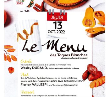 A l’occasion de la Semaine du Goût, jeudi 13 octobre, sera servi sur l’ensemble des restaurants scolaires du territoire du syndicat, le Menu Toques Blanches. Action menée en partenariat avec l’association des Toques Blanches du Roussillon Occitanie. TROIS chefs Toques Blanches ont proposé un recette et les chefs cuisiniers de la cuisine centrale ont dû…