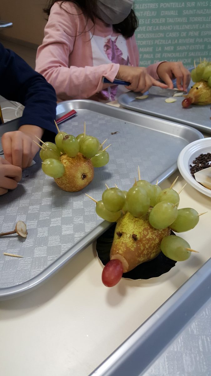 Les enfants sont mêmes repartis avec leur création . Un dauphin ou un chien réalisé avec une banane. Un petit hérisson avec une poire.